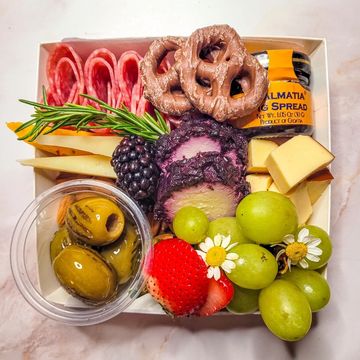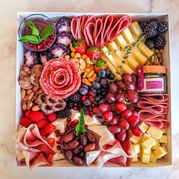 12x12 gift box. Serves 4 to 7 people. 3 Cheeses and 3 Meats