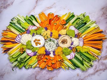 An assortment of fresh veggies and dip. 22x12 oblong tray.